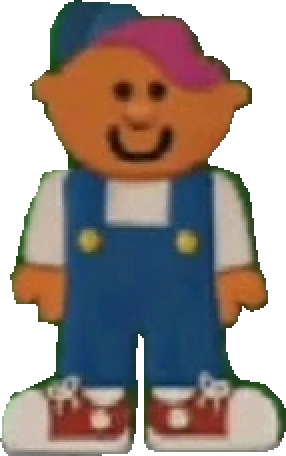 Felix is a boy with purple hair and orange skin. He wears blue overalls with yellow buttons a white shirt and red and white sneakers.