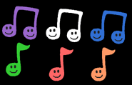 The Notes are blue with smiley faces. They come in all kinds of forms including wholes, halves, quarters, and eighths. The Notes are red, white, purple blue, orange, and green with smiley faces.